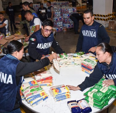La Secretaría de Marina (Semar) refuerza la distribución de ayuda humanitaria a los municipios más afectados por las lluvias intensas.